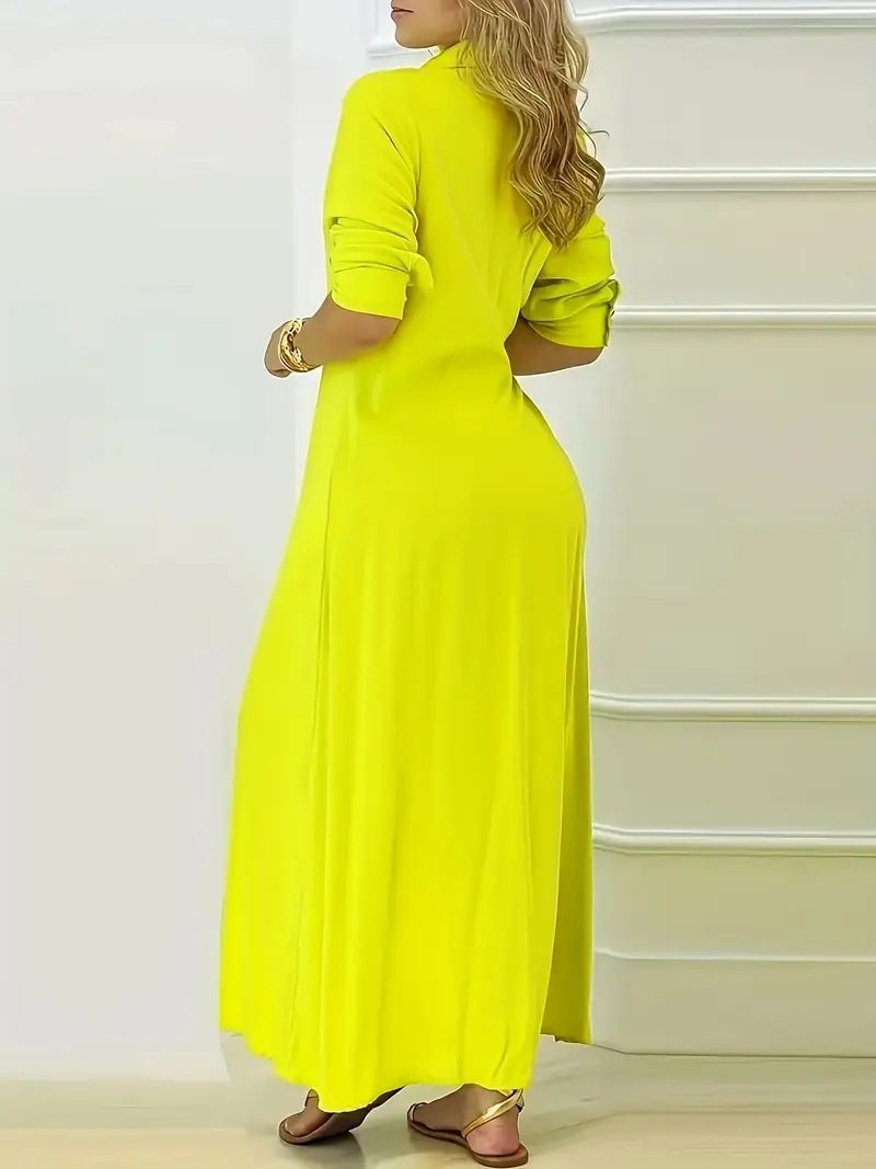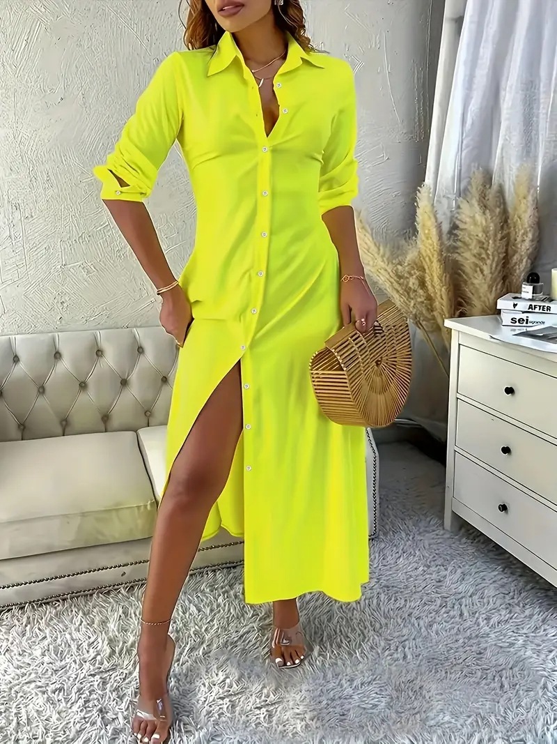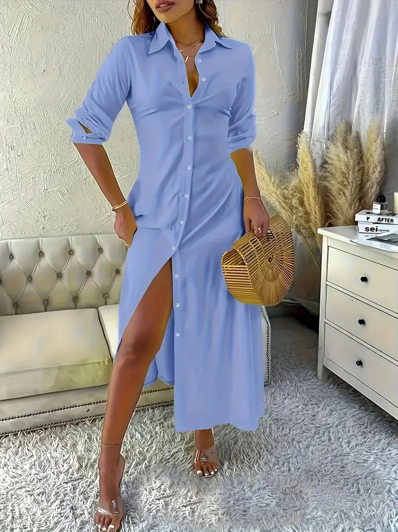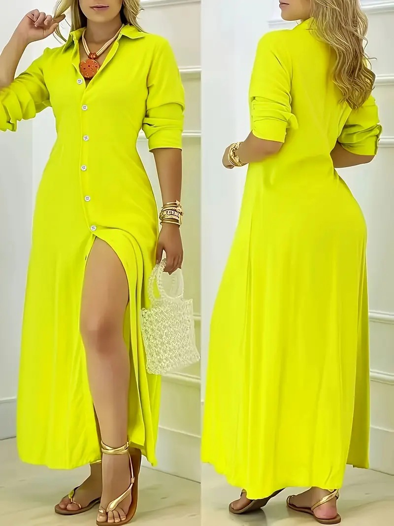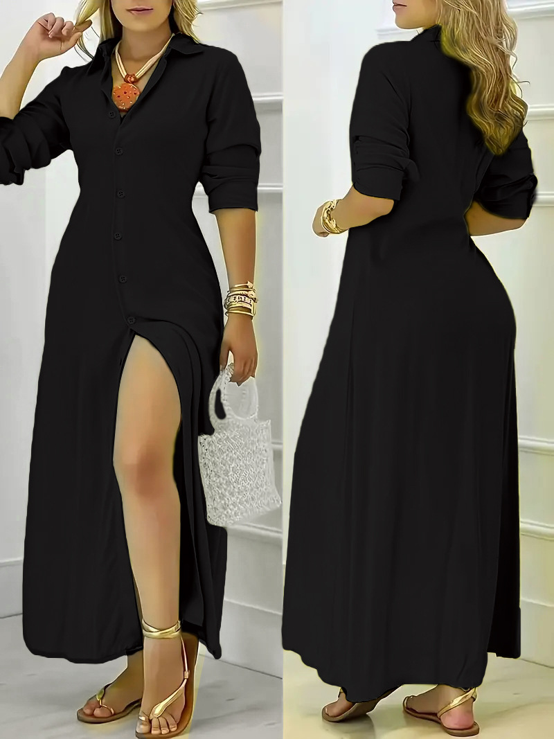 Autumn Womens Elegant SolidColor LongSleeve ButtonUp Shirt Dress