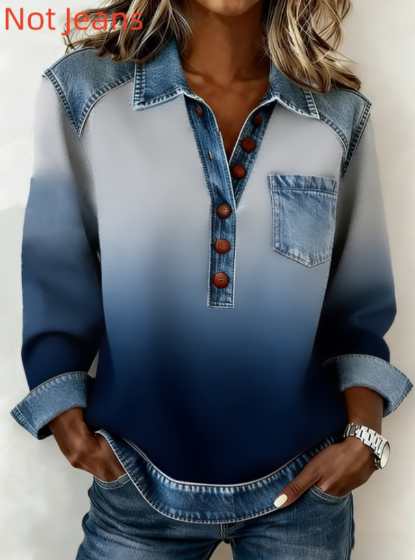 Denim Patchwork Collar Button-down Casual Long-sleeved Top