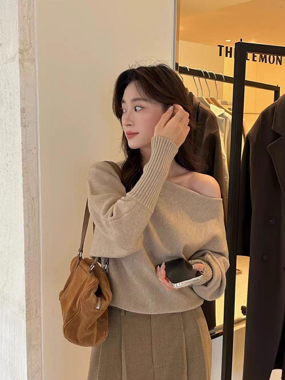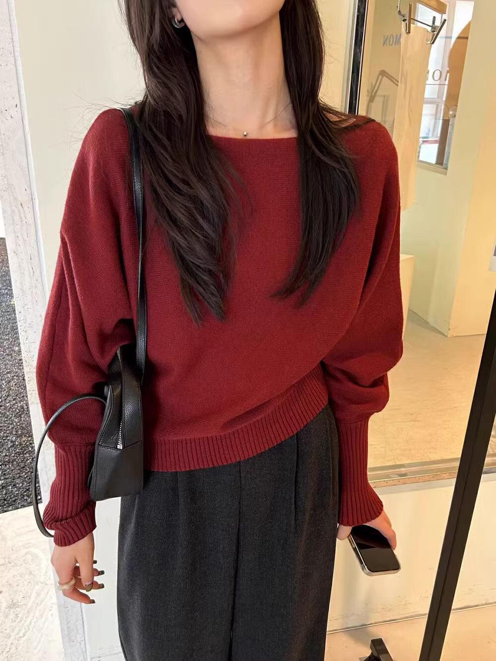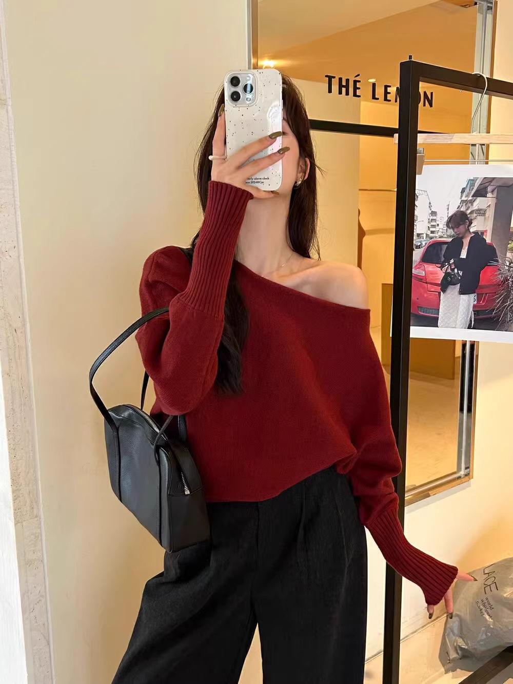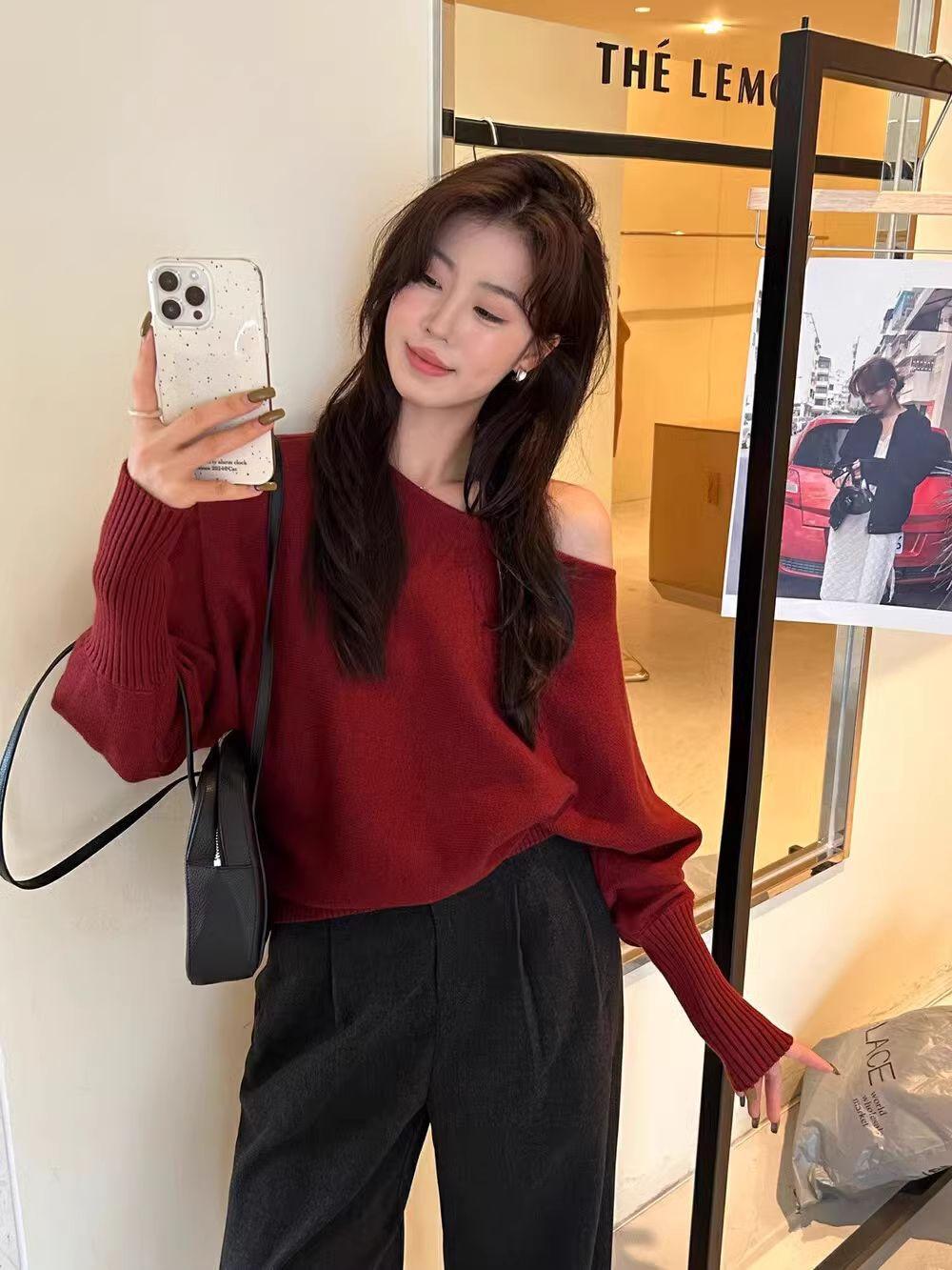 Korean-style Elegant Red Long-sleeve Knit Top With A Slanted Shoulder Design