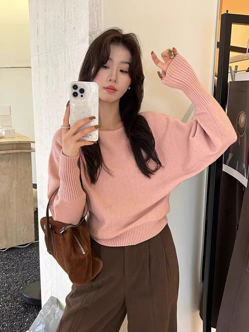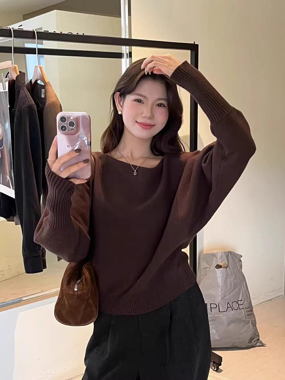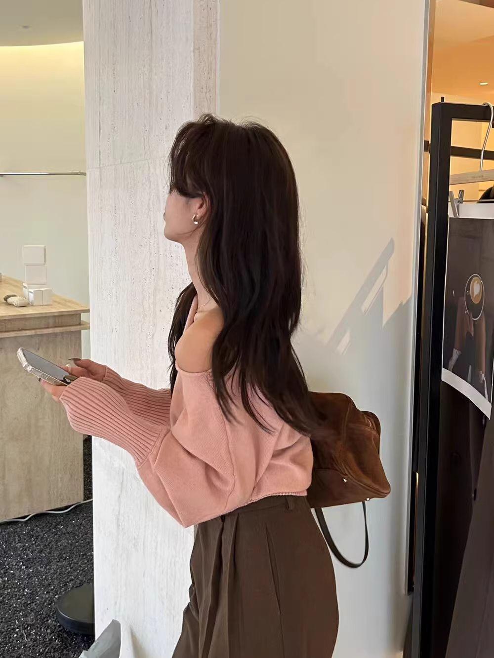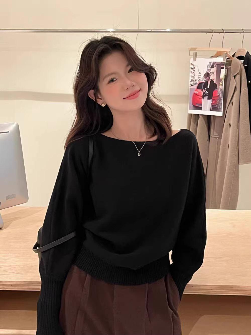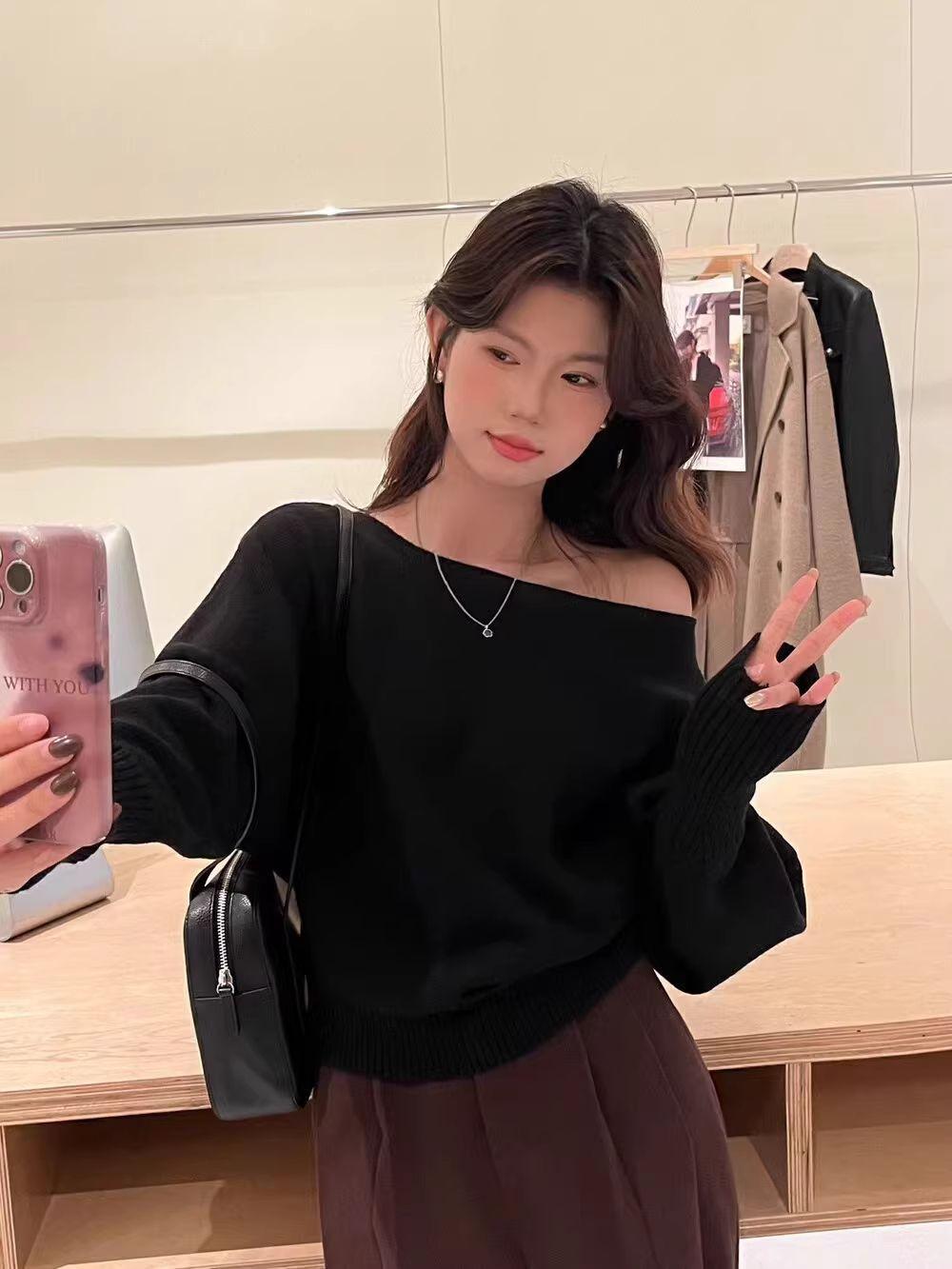 Korean-style Elegant Red Long-sleeve Knit Top With A Slanted Shoulder Design
