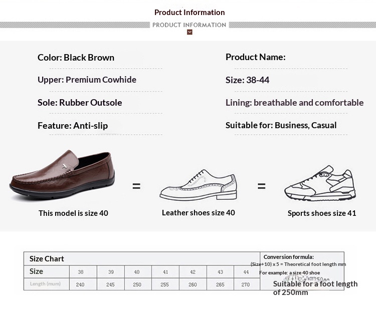 Sizes: 38 (shoe size 240), 39 (shoe size 245), 40 (shoe size 250), 41 (shoe size 255), 42 (shoe size 260), 43 (shoe size 265), 44 (shoe size 270)