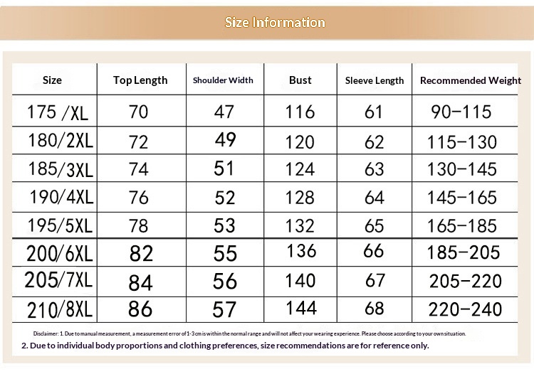 Sizes: 175 (100–120 jin), 180 (120–135 jin), 185 (135–150 jin), 190 (150–165 jin), 195 (165–185 jin), 200 (185–200 jin), 205 (200–210 jin), 210 (210–230 jin)