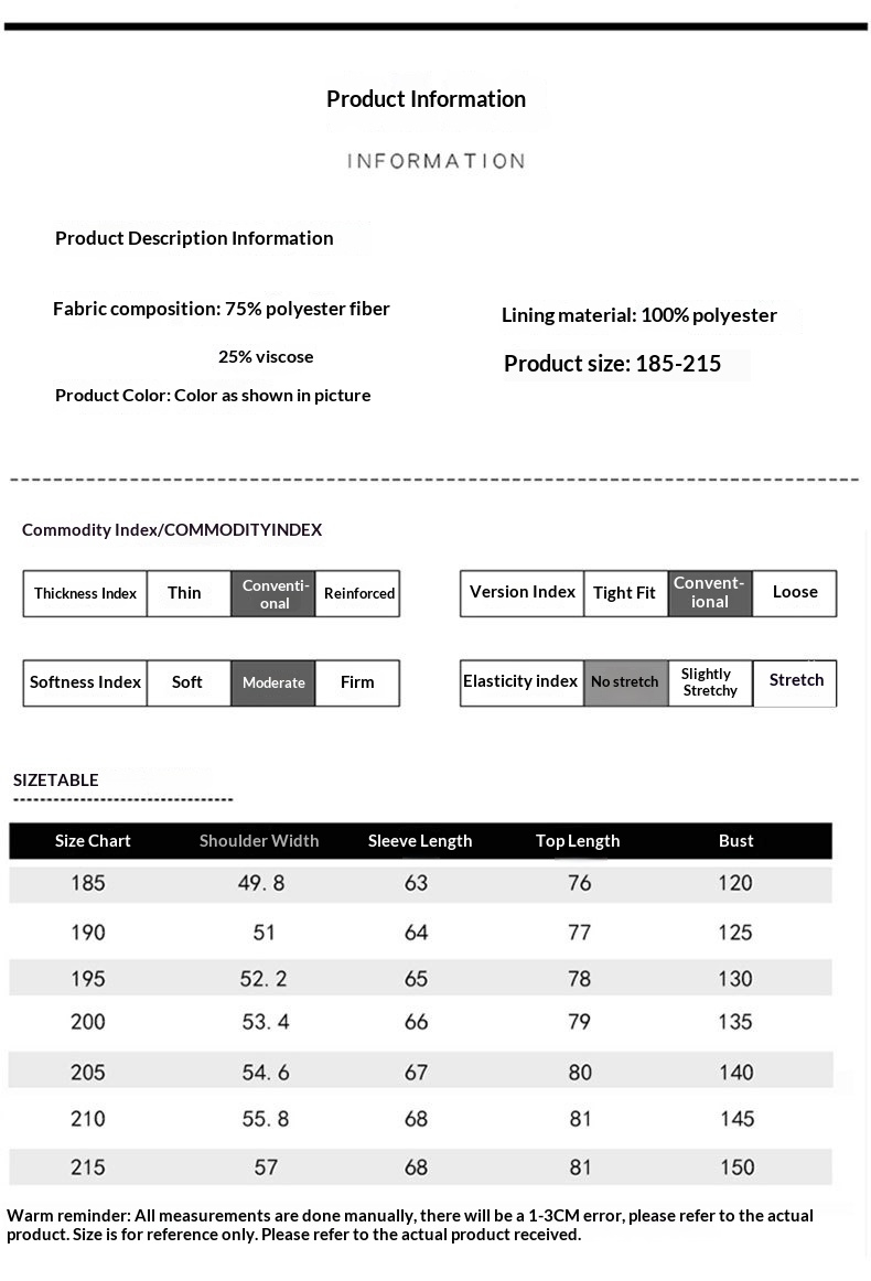 Sizes: 2XL/185, 3XL/190, 4XL/195, 5XL/200, 6XL/205, 7XL/210, 8XL/215