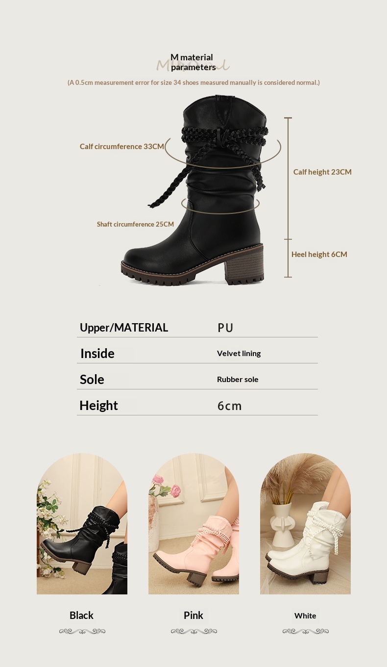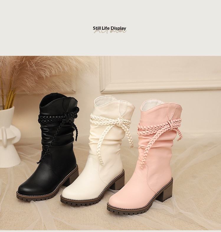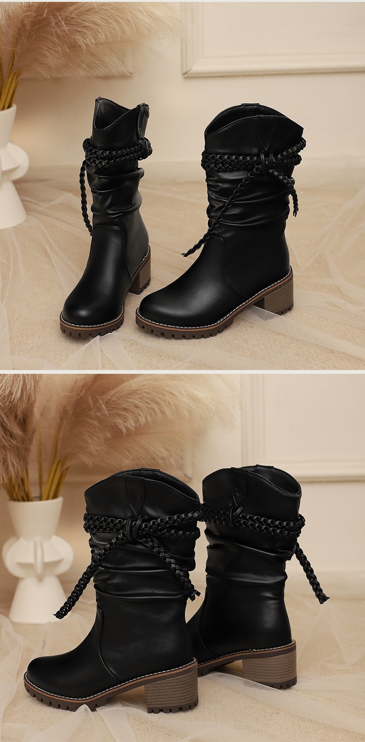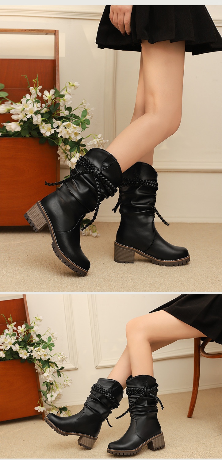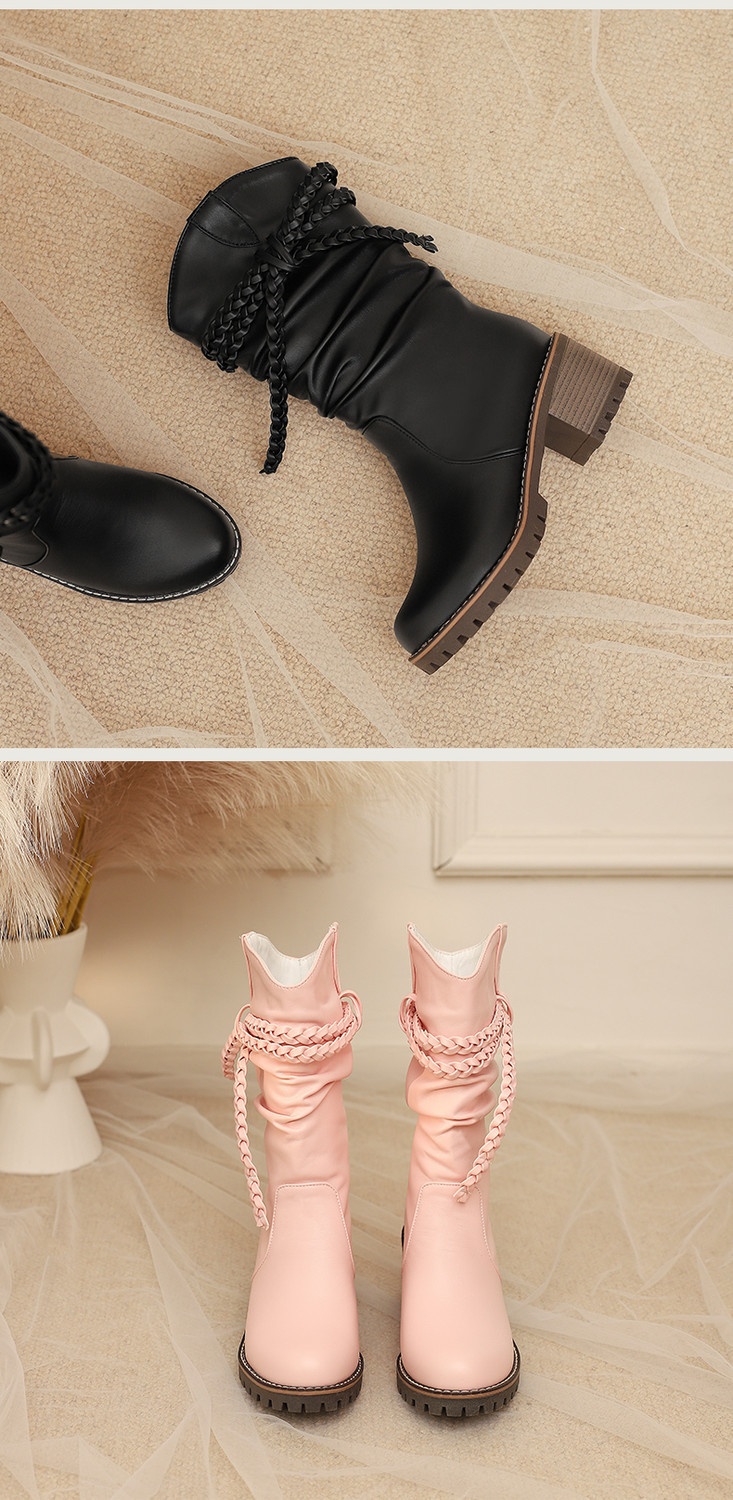 Womens Fashion Knitted Strap Mid-Calf Boots With Chunky Heels